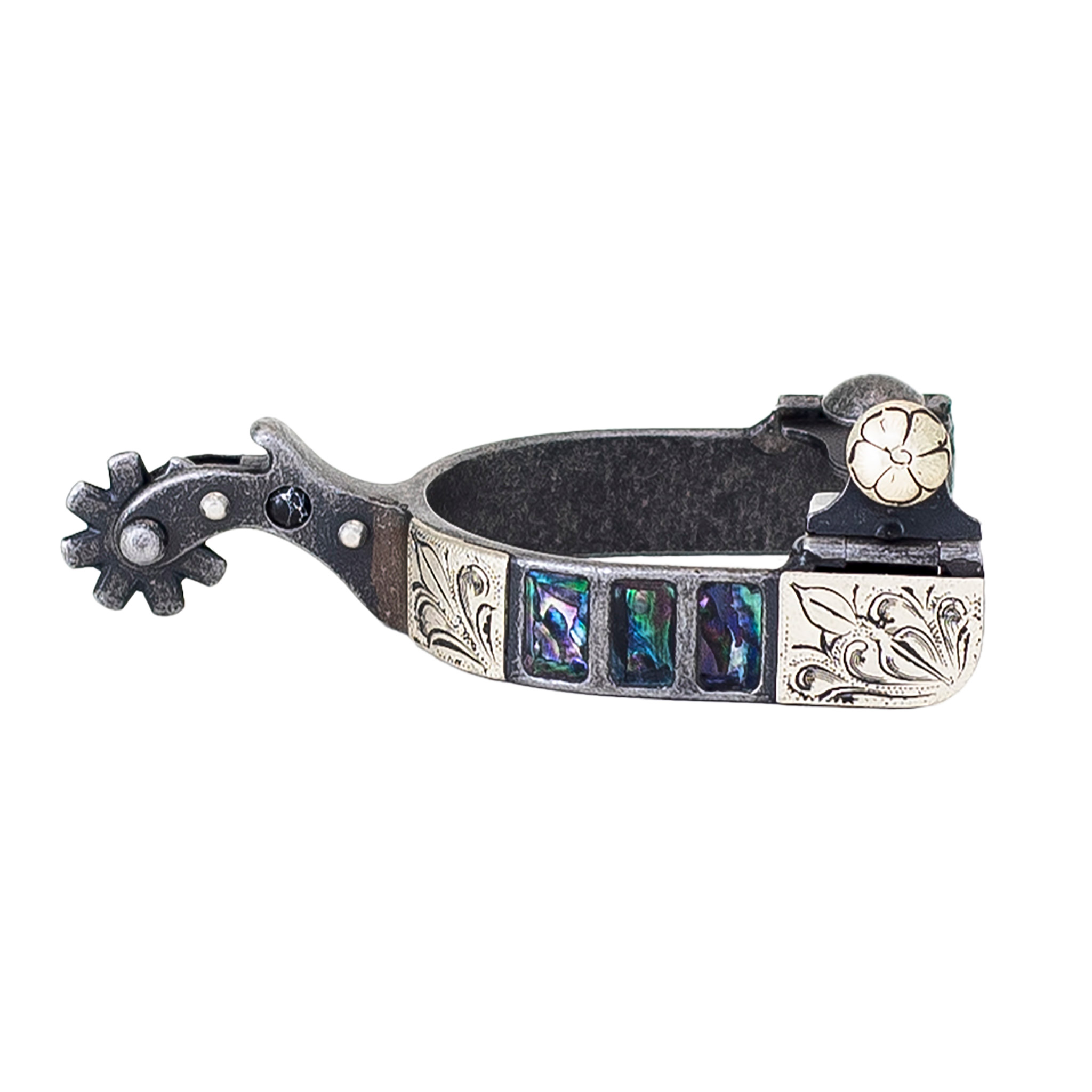 Black pearl inserts, trims and dots, stunningly set on a background of dark grey steel, would be the fashionable choice for any rider. 19mm (3/4”) Band, and 8-point 25mm (1”) rowel. Medium cup size with 38mm (1 1/2”) shank with chap guard. Sold as a pair.
