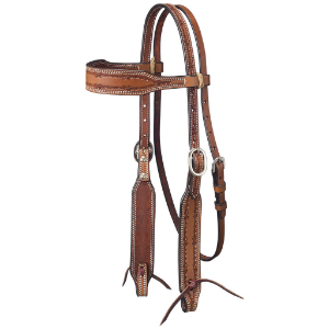 Stylish and fun, this premium cowhide headstall has a barbed wire stamp pattern. Wide browband design with adjustable buckle cheeks and throatlatch.