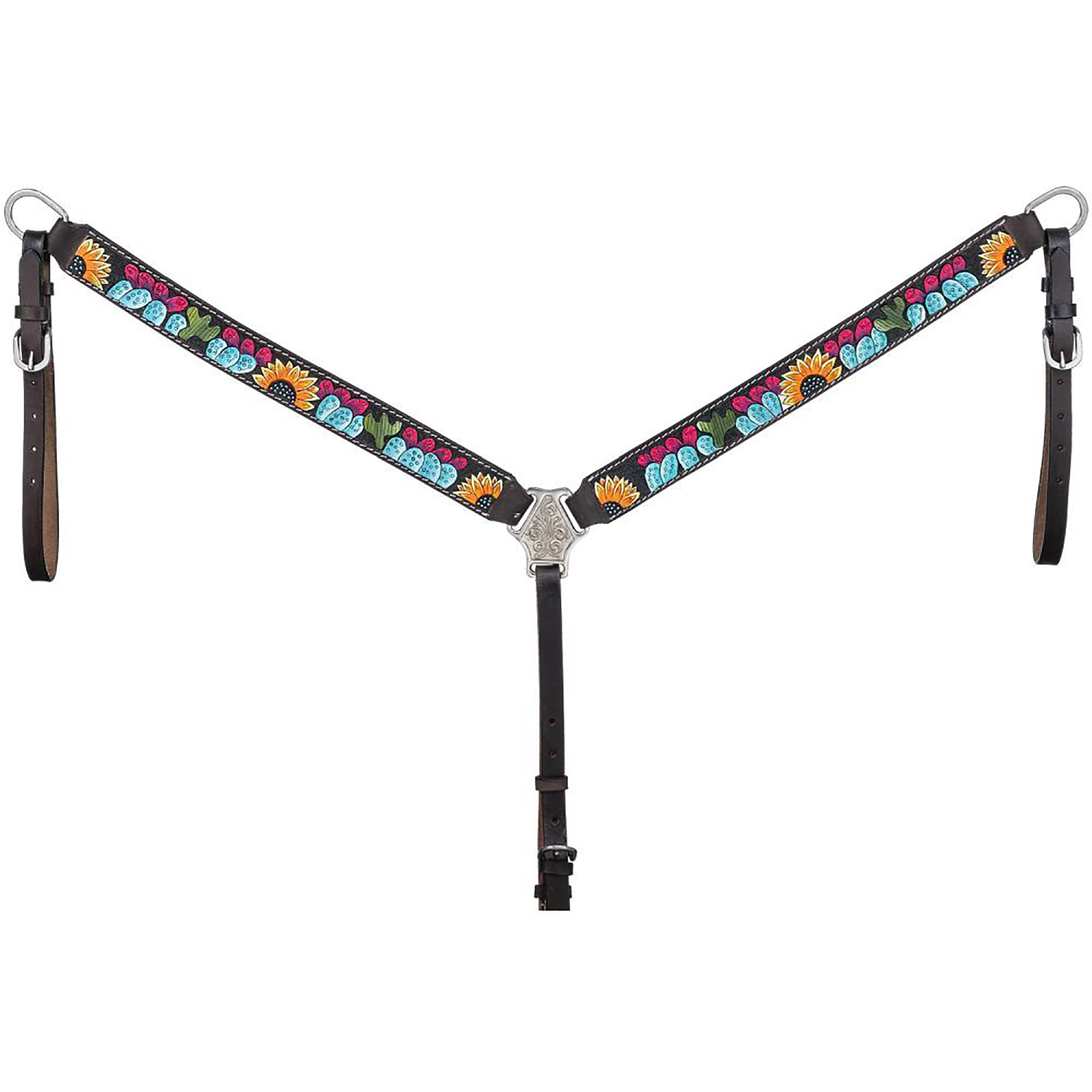 Ride with the spirit of the desert on your side with this fun southwestern-inspired breastcollar! The durable, dark oil leather is contrasted with colorful hand-painted cacti and sunflowers. Finished with a crisp single-stitched white edge and an engraved center piece.