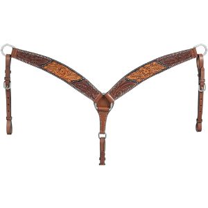 The Cow Puncher breastcollar is crafted with quality two-tone leather and designed with a contour shape for excellent fit. Accents include floral hand tooling and silver dots for a bit of shine. Complete with adjustable tug straps.