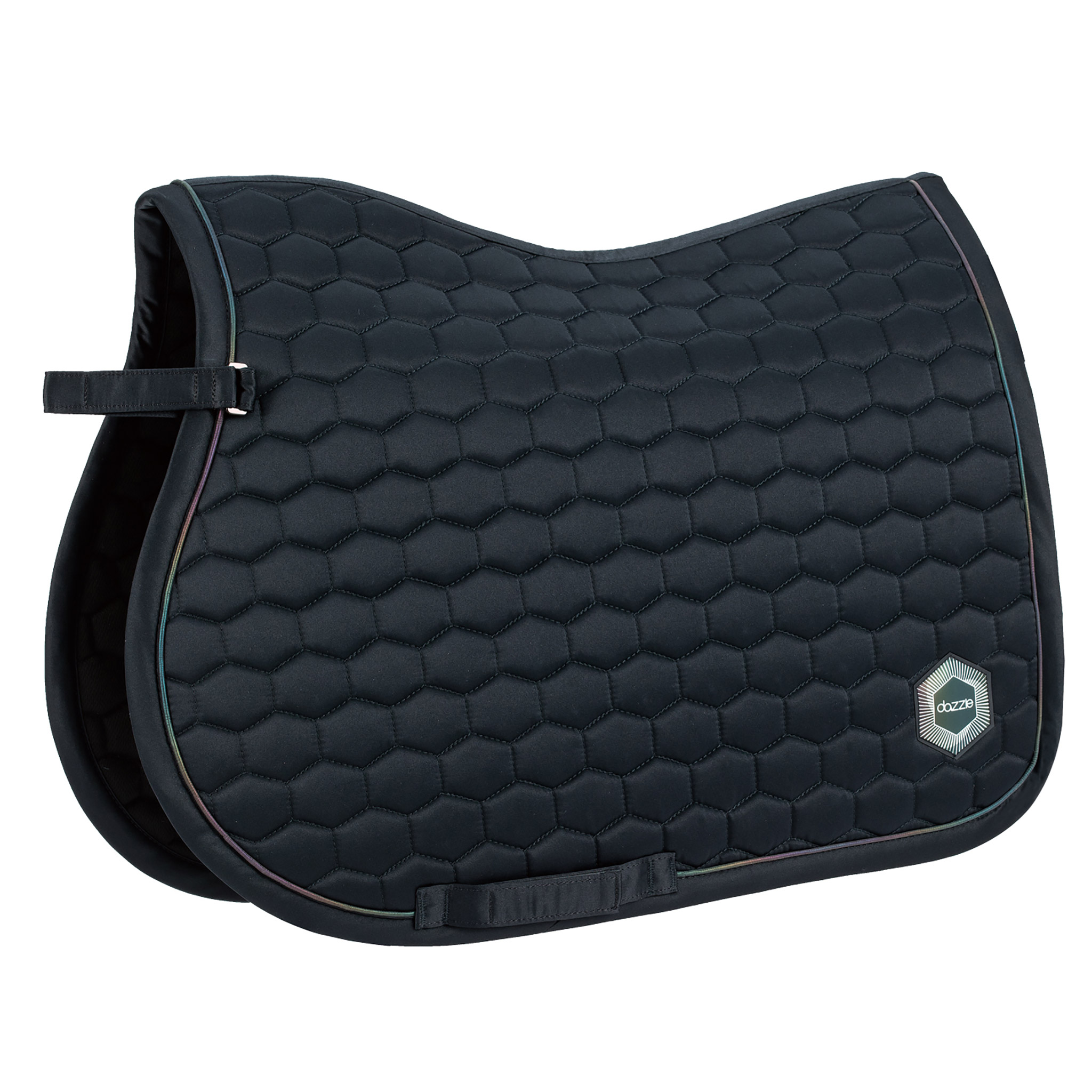 The Dazzle Saddlecloth is a sleek and stylish design featuring a satin binding and honeycomb quilting. The reflective multi-coloured piping and high-frequency logo add a unique touch of colour.